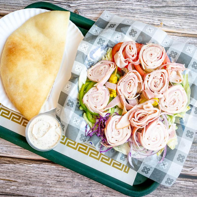 All salads are served with fresh homemade pita and side dressing • Extra Dressing +$0.75 | Extra Pita +$0.75 | Extra Feta +$1.00